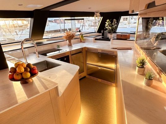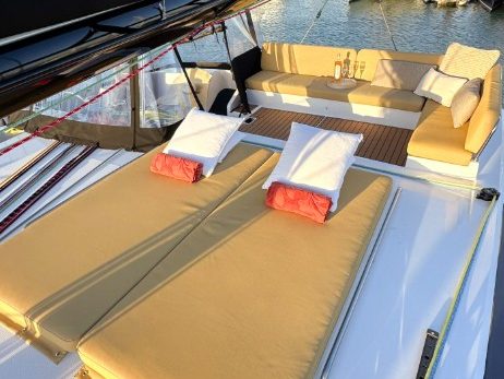Innovative Materialien & Umweltaspekt: Der Einsatz von Flachs/Kork, die Möglichkeit zur Solar‐ und Lithium-Ausstattung verweist auf das moderne, nachhaltig orientierte Yachtkonzepte.