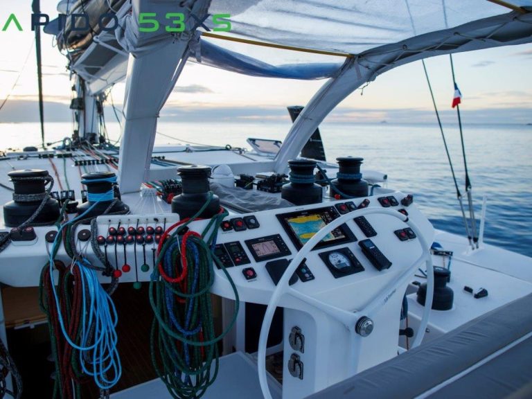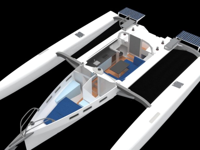 Die Carbon/Composite-Sandwich-Bauweise sorgt für ein extrem leichtes, steifes und sicheres Boot. Zertifiziert nach CE-Kategorie A, ist der Trimaran ideal für schnelles Blauwassersegeln.