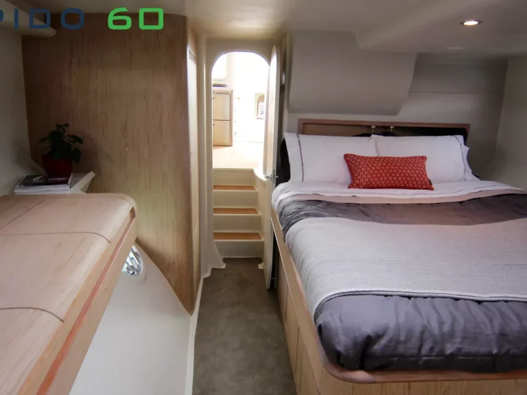 Der Rapido 60/63 bietet: Zwei Doppelkabinen im Vorder- und Achterschiff. Im Salon können beim 63 zwei Klapptische in zusätzliche Schlafplätze umgewandelt werden, sodass sich Doppel- oder Einzelbettkonfigurationen ergeben. Ideal, wenn zusätzliche Gäste anwesend sind. Anpassung der Oberflächen, einschließlich Holzfurniere und Polster.