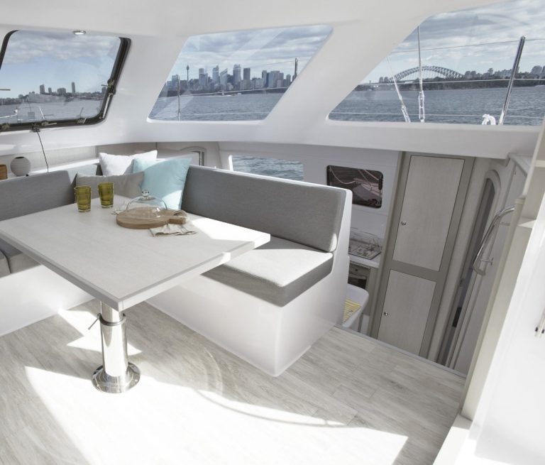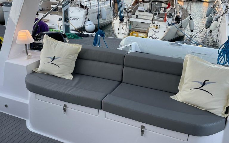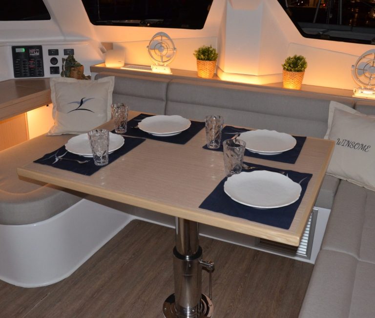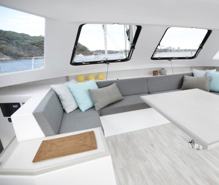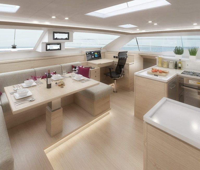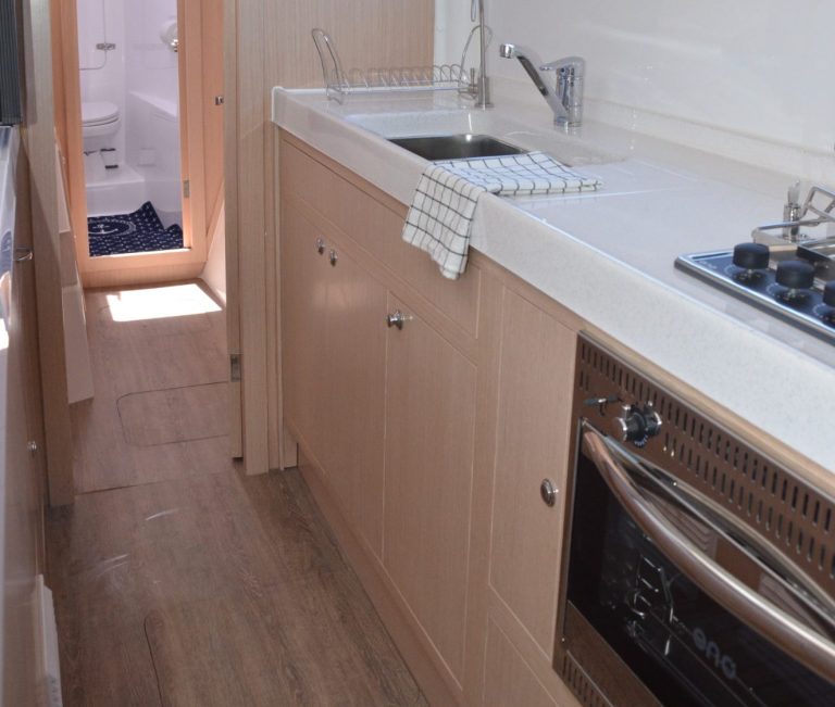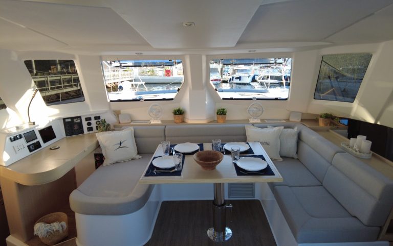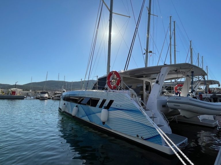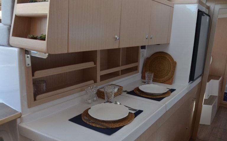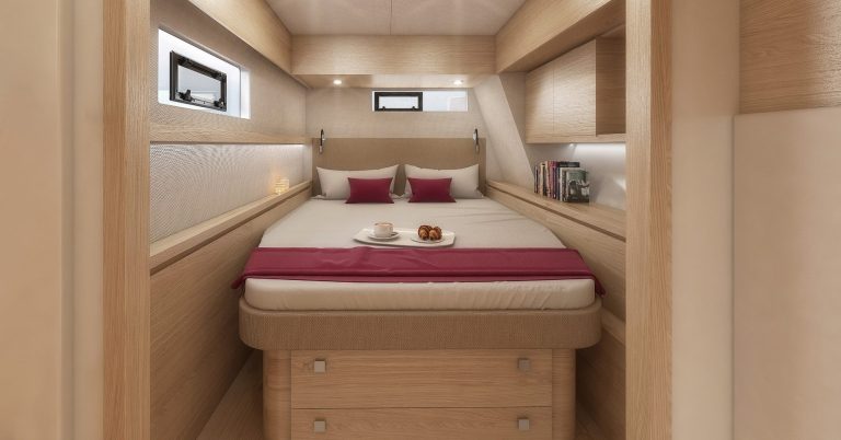 Im Innenraum bietet der Katamaran helle Kabinen, viel Stauraum und eine hochwertige Verarbeitung, die auf Langlebigkeit ausgelegt ist. Gleichzeitig sorgen breite Laufdecks, stabile Konstruktionen und geschützte Steuerbereiche für ein hohes Maß an Sicherheit auf See.