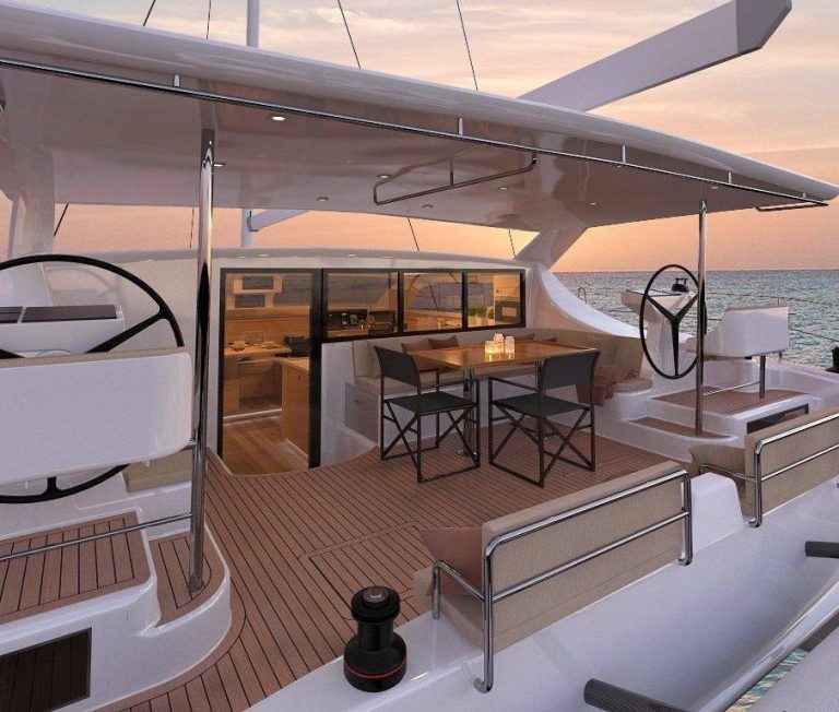 Auch das Cockpit- und Steuerkonzept folgt diesem Anspruch: Zwei Steuerstände seitlich bieten optimale Sicht auf Segel, Rümpfe und Manöver – auch beim Anlegen. Sämtliche Fallen und Schoten sind ins Cockpit geführt, was die Yacht problemlos einhandtauglich macht. Die geschützten Steuerstände sind dabei kein Marketingdetail, sondern ein klarer Vorteil für Offshore-Passagen und anspruchsvolle Bedingungen. Das Raumkonzept setzt auf durchdachten Komfort ohne unnötiges Gewicht. Verschiedene 3- und 4-Kabinen-Layouts bieten viel Licht, gute Belüftung und funktionale Wohnqualität – ohne den überladenen Luxus, der bei vielen Charter-Katamaranen zulasten der Segeleigenschaften geht.